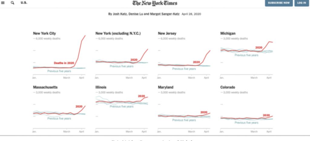 But it is the graph from the New York Times the tells the story best. It does not identify cause of death, just numbers from coroner’s offices from around the country. Take a look. It shows the number of deaths from January through April in the previous 5 years as shown in the blue lines. In red, it shows the number of deaths in 2020. Call it COVID, pre-existing conditions, age-related complications of flu, suicide, whatever you wish, but look at the trend.
