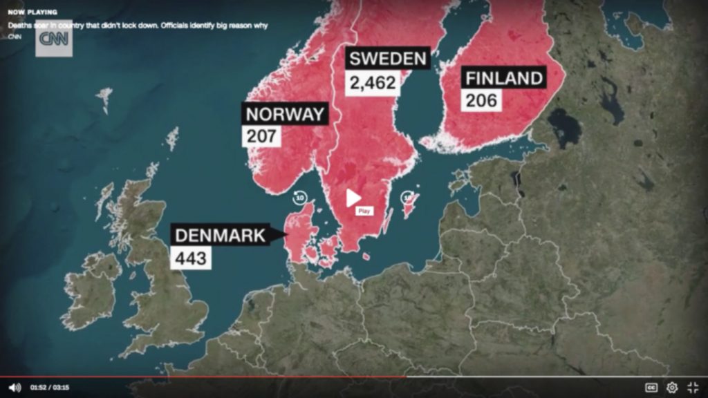 Meanwhile, Sweden has been touted as the poster child for allowing “nature to take its course. We all watched – enviously – as they decided to allow life to continue as normal. The result are now coming in as you can see from the image. Their death rates are from 5 to 10 times higher than their Scandinavian neighbors, about half of the victims living in elder care homes.
